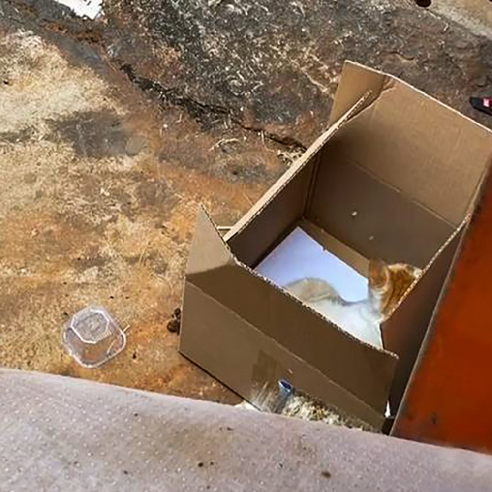 奴才將貓咪安頓在一個紙箱裡,裡面備了一些食物和水,並放在一個較為隱密的角落。