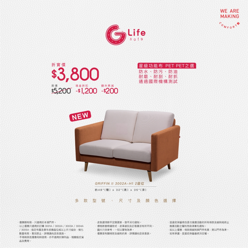 看完小編推介,各位主人是否非常心動想挑選一張屬於你和心愛毛孩的梳化呢?機會來了!茲曼尼GIORMANI G ‧ Life Sofa系列現推出新品GRIFFIN II 3002A期間限定優惠*,2座位折實價只需要HK$3,800(原價HK$5,200),以超抵價就能一次過擁有星級功能布的三防功能,CP值超高呀!大家更可以藉着新一輪消費券購買,分分鐘只需付HK$800就可以擁有啦!