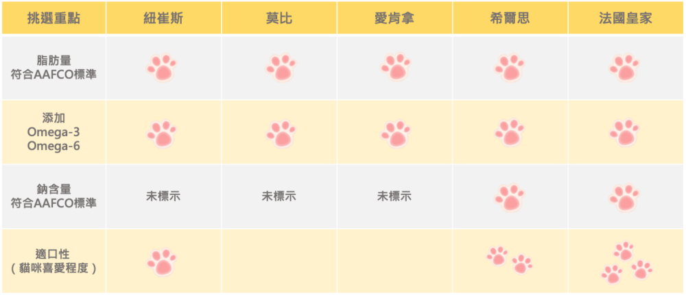 紐崔斯的脂肪量也是這次五款中最低的,不用擔心飲食肥胖問題,且其中含有Omega-3和Omega-6,讓毛髮生長更漂亮、有效預防心血管疾病。鈉含量的部分並沒有明確標示,但經過小編認真的做功課、調查,許多貓奴們都有分享貓咪蠻愛吃這款飼料,但吃了之後喝水次數感覺有減少,所以建議大家要注意貓貓喝水、排尿的狀況!