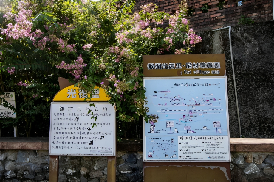 與貓咪的互動 猴硐貓村的設施充分考慮了貓咪的需求,並提供了蒞臨的遊客們更豐富的互動機會~首先,貓公所籌備處是一個宣導正確餵養貓咪的地方,外牆飾以Q版貓咪插圖壁畫,可愛至極!在這裡,你可以獲得關於貓咪的寶貴知識,並瞭解如何更好地照顧這些貓咪們~