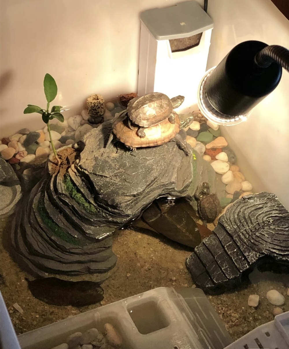 烏龜需要一個安全的巢穴和藏身處,這樣牠們可以躲避潛在的危險或感到舒適和放鬆!你可以在水族箱中設置一個小巢穴或岩石結構,讓烏龜有一個屬於自己的私人空間~