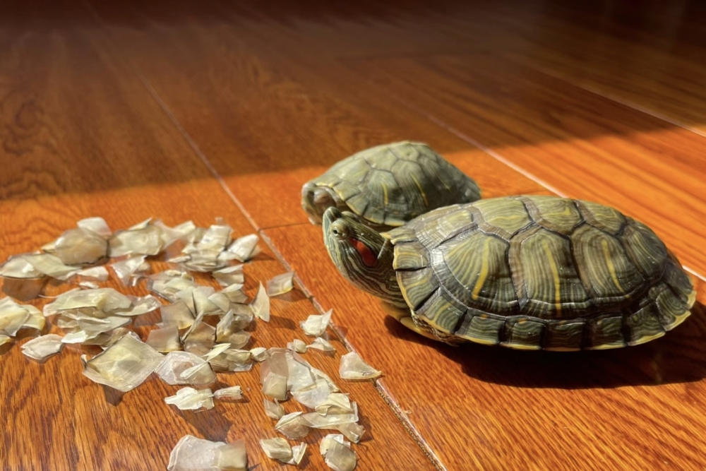烏龜脫殼是一個相當神奇的過程!當烏龜開始長大,牠們的外殼會開始出現裂痕~這些裂痕會逐漸擴大,直到整個外殼分裂成幾塊小片!然後,烏龜會從這些裂片中抽身而出,就像我們脫掉衣服一樣~新的外殼在幾個星期內重新長出,並與原來的外殼一樣堅硬!