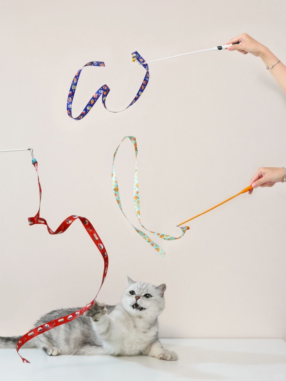逗貓棒是一種長度約30至60公分之間,配有彈性繩或線的玩具~其外形通常是一根柔軟的棍子,頂端則裝飾著各式各樣的羽毛、毛球或其他有趣的物品!這種玩具的作用在於模仿鳥類或昆蟲的動作,引起貓咪的注意並激發它們的狩獵本能~