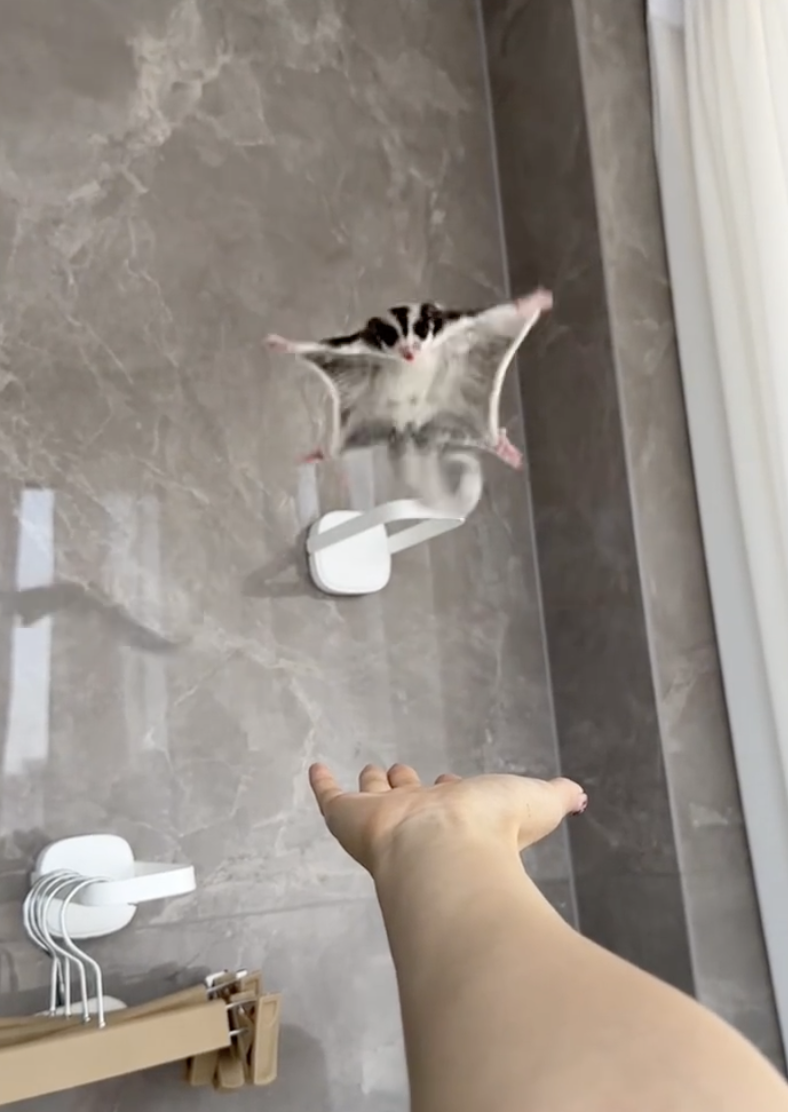 蜜袋鼯的飛行訓練應該從「跳躍」開始,而不是直接讓牠從高處滑翔。初期可以從椅子或矮桌開始,讓牠跳到你的手臂上,或輕輕將牠舉起再釋放,讓牠熟悉離地與落地的感覺。這些短距離的成功經驗有助於建立牠的信心,也能讓牠逐漸學會在空中展開飛膜。