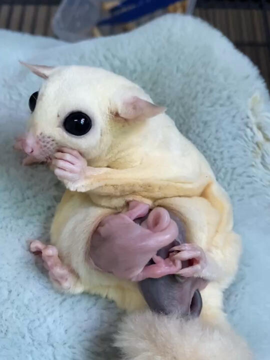 蜜袋鼯的繁殖季節主要在春季和夏季,雌性每年可以繁殖1-2次~交配後,胚胎在雌性的子宮內發育僅15-17天便會出生!此時,幼崽的體型極小,僅約一顆花生米大小,眼睛尚未睜開,四肢和器官也未完全發育~初生的幼崽會依靠其強壯的前肢,爬行至母親的育兒袋中!