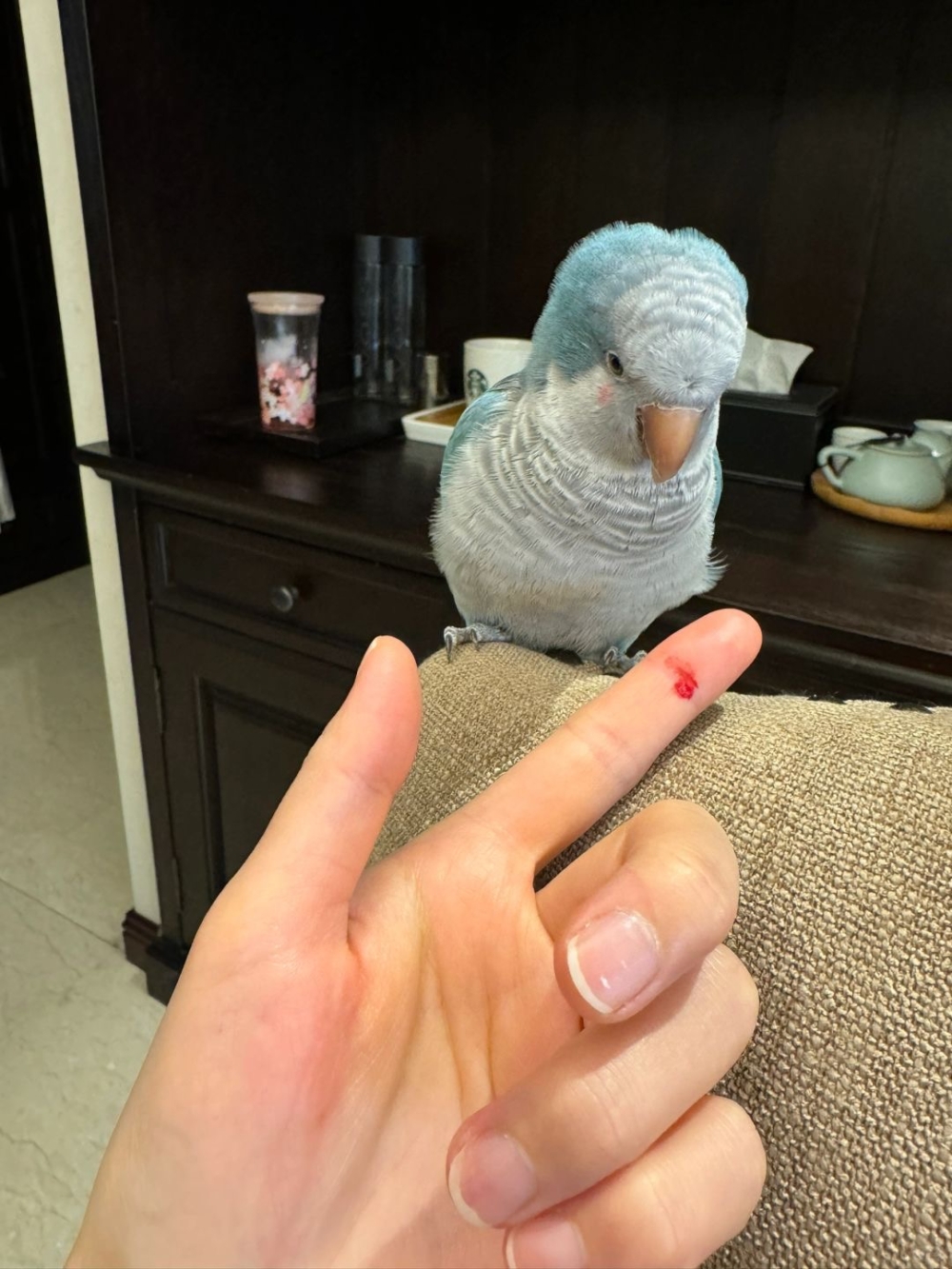 當鸚鵡咬人時,不要立刻把手抽回,而是輕輕地說「不」,然後忽視牠一段時間!這樣鸚鵡會逐漸明白咬人是不對的~