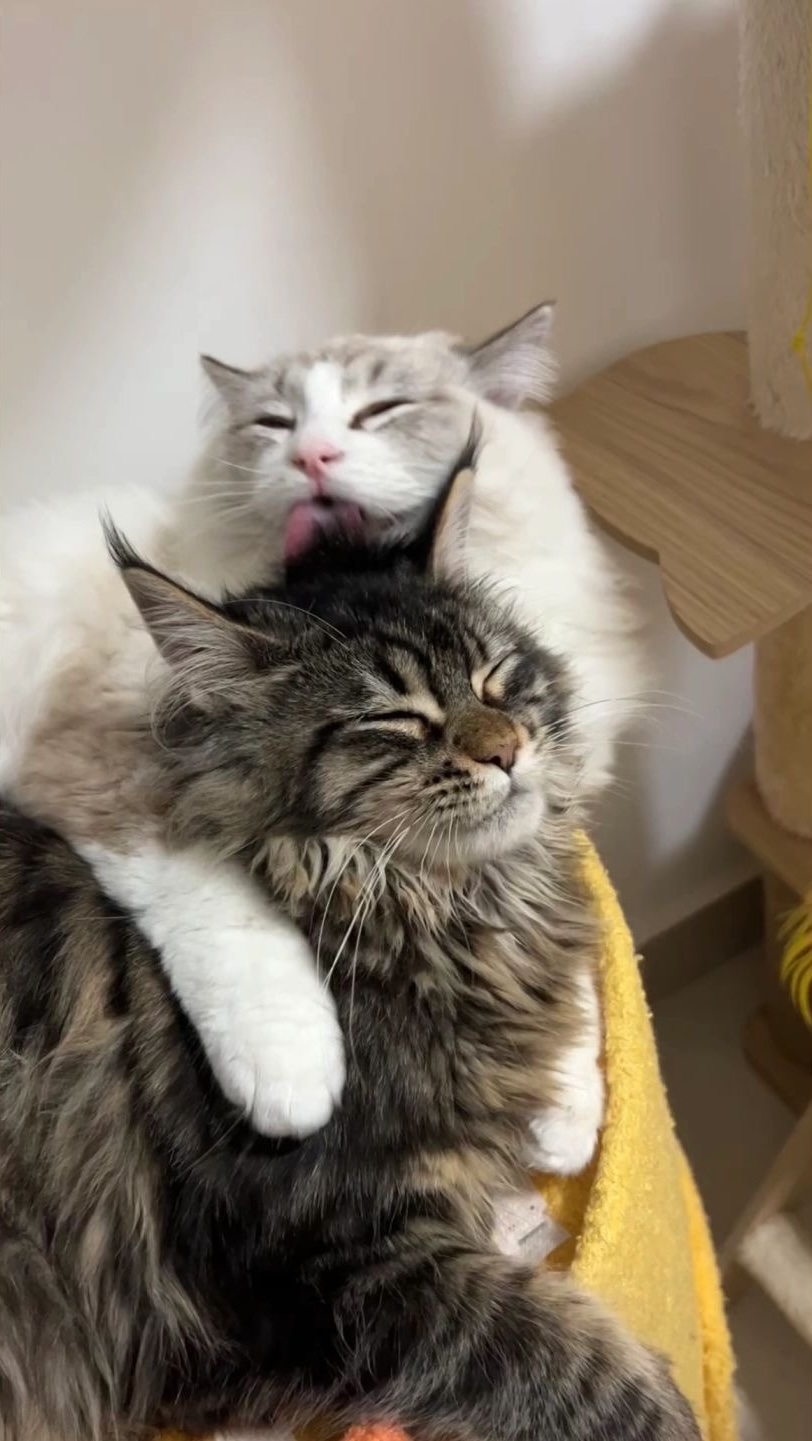 貓咪在睡覺時是最為放鬆和脆弱的時刻,牠們願意和其他貓咪共享這樣的時間和空間,說明牠們對彼此的信任度極高~這種行為不僅能提供身體上的溫暖,還能通過互相依偎增強情感聯繫!