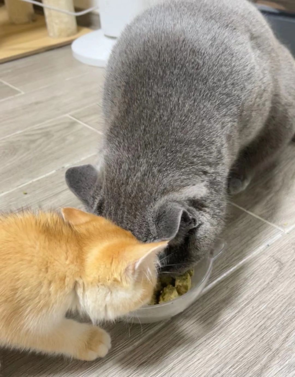 貓咪通常防備心重,會在四下無人的時候進食!如果牠們願意並排用餐或共食一碗食物,表示彼此毫無戒心~貓咪在用餐時間特別敏感,因為這時牠們最容易受到攻擊!如果你的貓咪們能夠在彼此身邊安心地吃飯,甚至分享食物,這意味著牠們之間建立了非常強的信任關係~