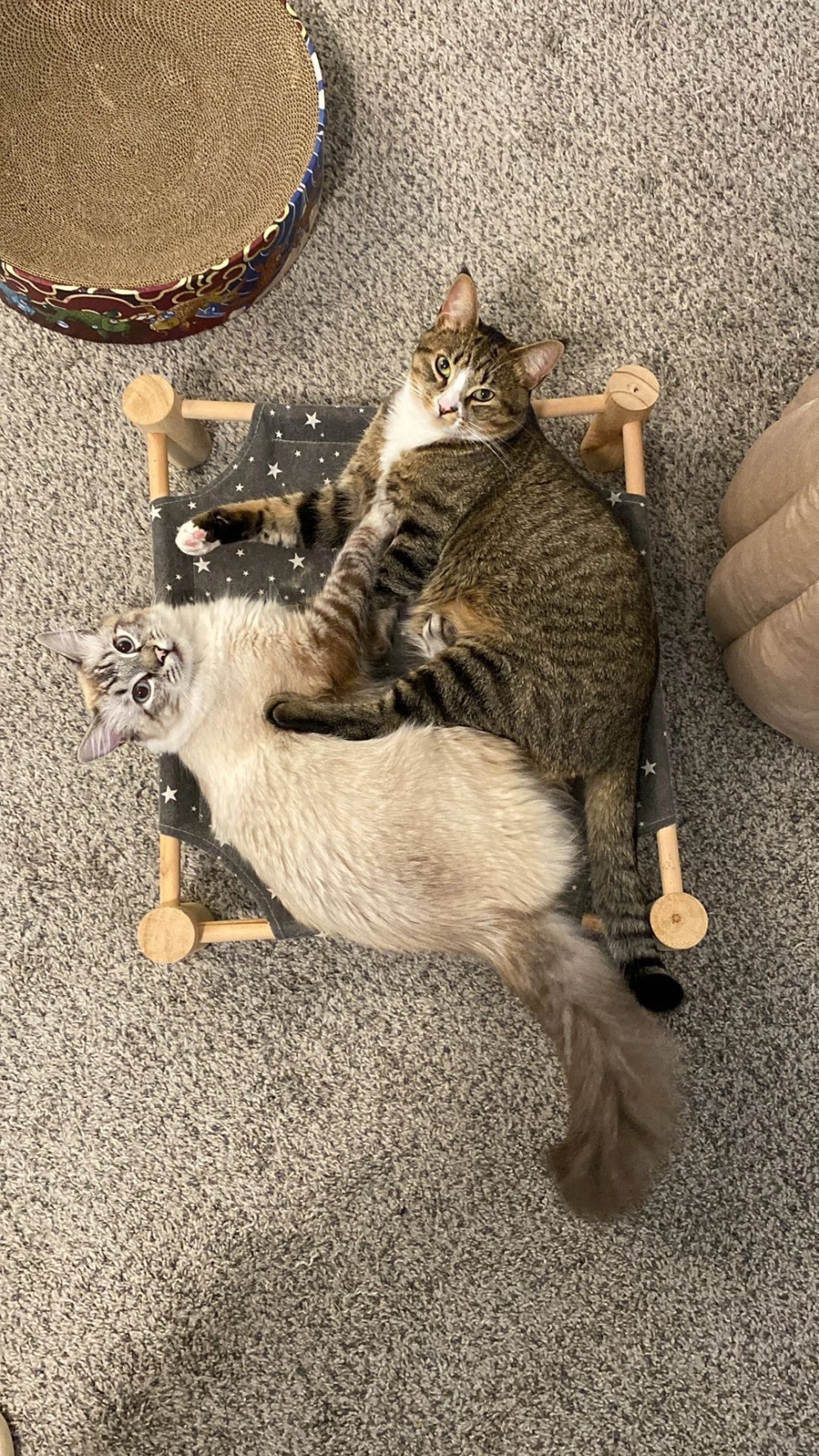 雖然貓咪睡在一起不一定代表感情好,但如果牠們能在各種環境下窩在一起,甚至尾巴交纏,那就是真感情的象徵!當貓咪們選擇靠近並且在一起睡覺時,牠們是在說牠們感到安全和舒適~這種行為顯示出高度的信任和互相依賴,尤其是當牠們的身體觸碰到一起、尾巴交纏時,更加突顯了這種親密感!