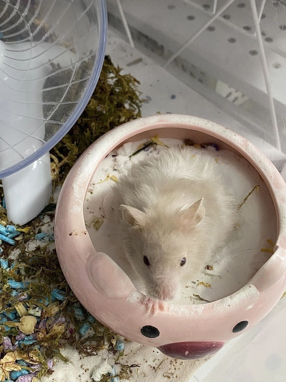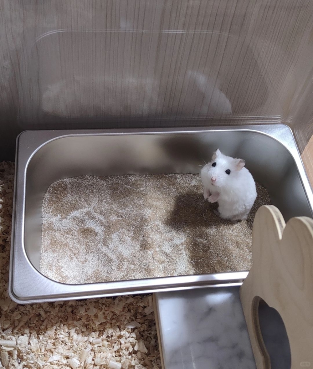 使用沐浴沙時,應觀察倉鼠的行為~如果倉鼠吃沙子或沙子沾到眼睛上,應更換沙子或更換沙盒!通常情況下,建議每週更換一次沐浴沙,但如果沙子變髒或有異味,應立即更換~一些倉鼠喜歡在沙子裡打滾或排便,這種情況下可能需要更頻繁地更換沙子,甚至每2-3天更換一次!