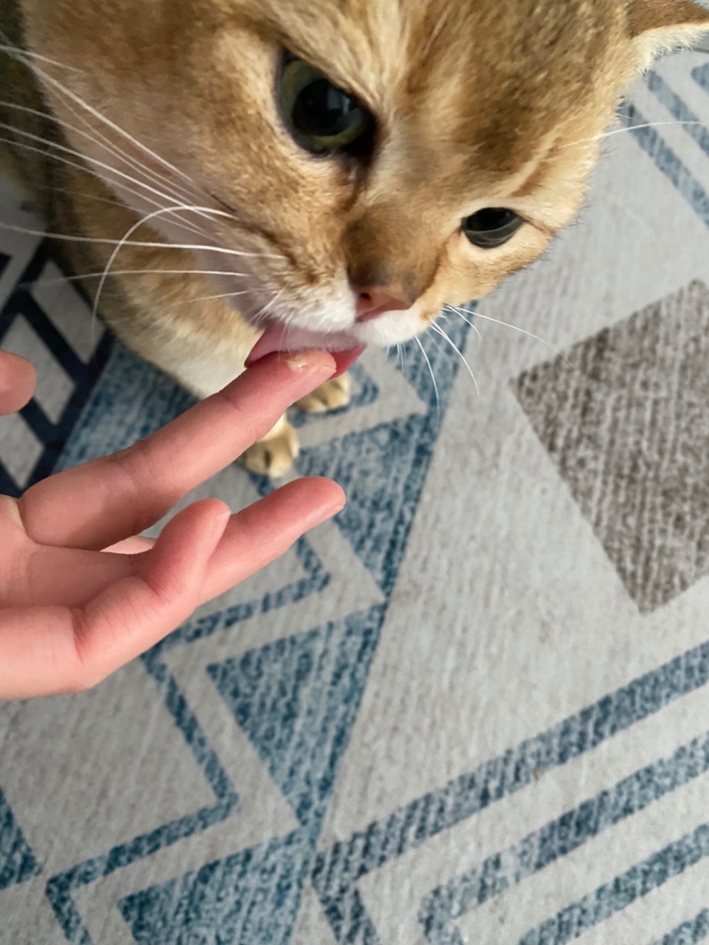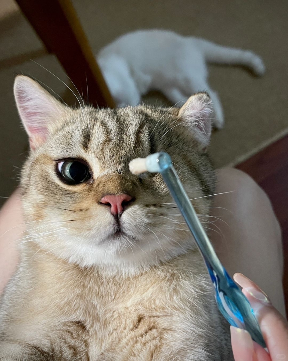 3. 讓貓咪熟悉工具:在開始刷牙前,可以讓貓咪先聞聞牙膏的味道,並將少量牙膏塗在手指上,輕輕地按摩牠的牙齦和牙齒~這樣可以讓貓咪習慣牙膏的味道與質感,並減少抗拒感!