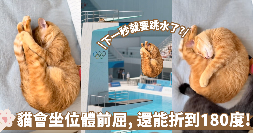 影片一出,不少網友立刻發揮創意,把這隻橘貓的折疊動作P成跳水選手,搭配泳池背景、比賽畫面,居然毫無違和感!那標準的抱腿姿勢加上完美的彎曲角度,看起來就像正準備入水得分,畫面搞笑又神還原~更好笑的是,這還不是特例喔!不少網友也紛紛曬出自己家貓咪的「折疊照」,一隻比一隻還能拗,彎得像軟糖一樣,看了只想問:你們是不是晚上偷偷在練功?!